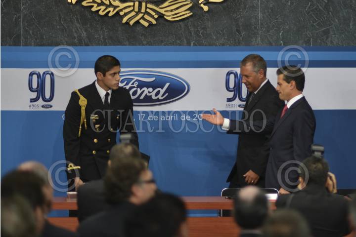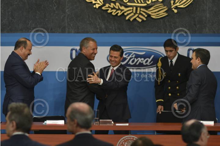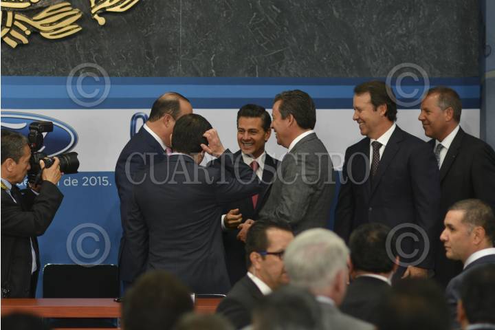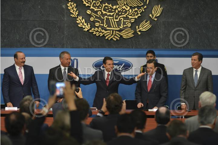 MÉXICO, D.F., 17ABRIL2015.- César Horacio Duarte Jáquez, gobernador de Chiahuahua, Joseph Hinrichs, presidente de Ford para las Américas, Enrique Peña Nieto, presidente de México, Ildefonso Guajardo Villareal, secretario de Economía y Miguel Márquez Márquez, gobernador del estado de Guanajuato, durante el anuncio de Inversión de los Proyectos de Motores y Transmisiones de Ford Motor Company en México, el cual pretende ampliar dos de sus fabricas, en el estado de Guanajuato y Chihuahua. FOTO: ADOLFO VLADIMIR/CUARTOSCURO.COM