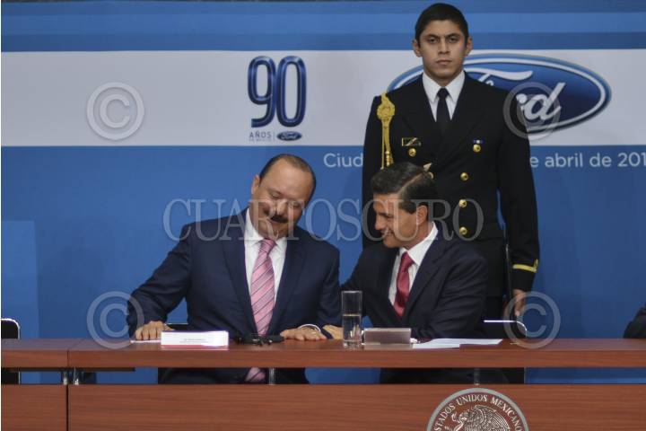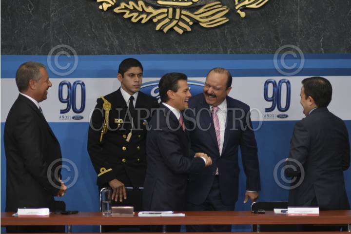 MÉXICO, D.F., 17ABRIL2015.- Céxar Horacio Duarte Jáquez, gobernador del estado de Chiahuahua y Enrique Peña Nieto, presidente de México, durante el anuncio de Inversión de los Proyectos de Motores y Transmisiones de Ford Motor Company en México, el cual pretende ampliar dos de sus fabricas, en el estado de Guanajuato y Chihuahua. FOTO: ADOLFO VLADIMIR/CUARTOSCURO.COM