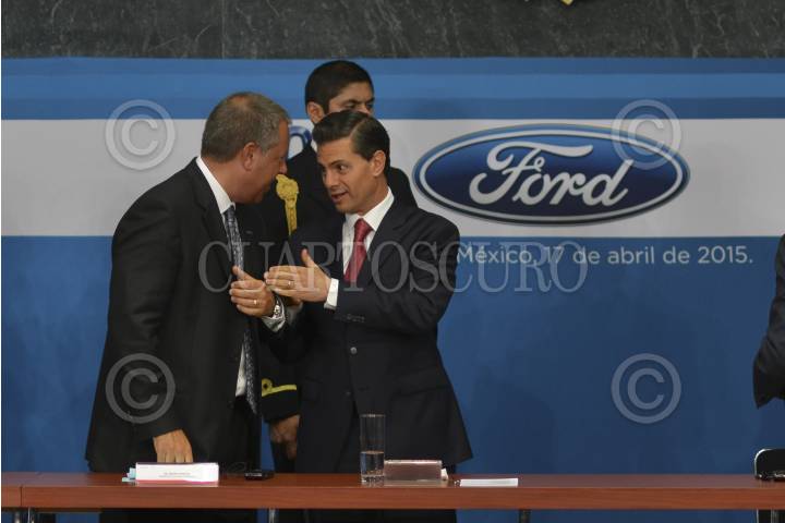 MÉXICO, D.F., 17ABRIL2015.- Joseph Hinrichs, presidente de Ford para las Américas y Enrique Peña Nieto, presidente de México, durante el anuncio de Inversión de los Proyectos de Motores y Transmisiones de Ford Motor Company en México, el cual pretende ampliar dos de sus fabricas, en el estado de Guanajuato y Chihuahua. FOTO: ADOLFO VLADIMIR/CUARTOSCURO.COM