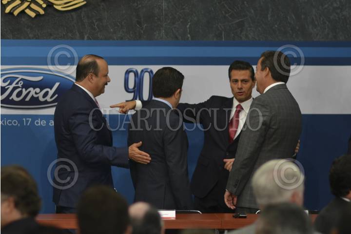 MÉXICO, D.F., 17ABRIL2015.- César Horacio Duarte Jáquez, gobernador de Chiahuahua, Ildefonso Guajardo Villareal, secretario de Economía, Enrique Peña Nieto, presidente de México y Miguel Márquez Márquez, gobernador del estado de Guanajuato, durante el anuncio de Inversión de los Proyectos de Motores y Transmisiones de Ford Motor Company en México, el cual pretende ampliar dos de sus fabricas, en el estado de Guanajuato y Chihuahua. FOTO: ADOLFO VLADIMIR/CUARTOSCURO.COM