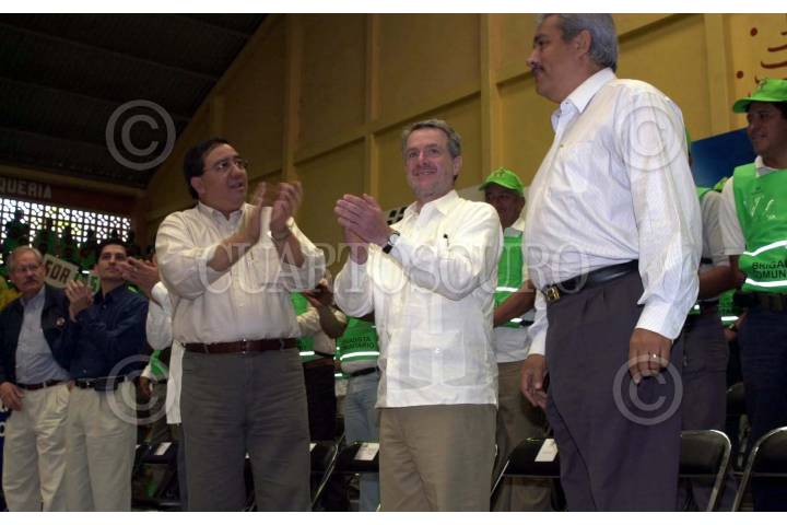 CINTALAPA, CHIAPAS14ABRIL2004.- El gobernador Pablo Salazar, el secretario de Gobernación Santiago Creel y el secretario del Medio Ambiente y recuesos naturales Alberto Cárdenas, durante la entrega de equipo contra incendios forestales a brigadistas comunitarios. FOTO: Sandra Perdomo/CUARTOSCURO.COM
