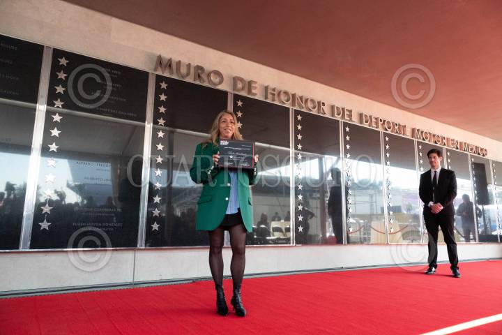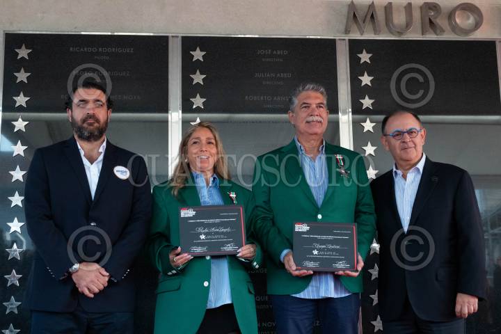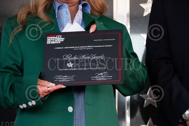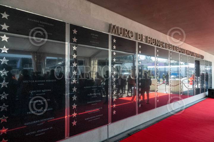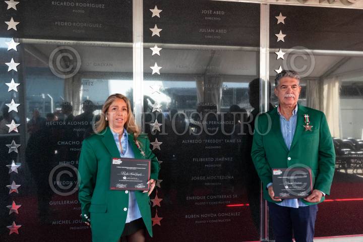 CIUDAD DE MÉXICO, 16OCTUBRE2024.- Los pilotos; Rubén Novoa González (quien no pudo asistir), y Enrique Contreras (in memoriam) fueron inscritos en el Muro de Honor del Deporte Motor en México, que se ubica en el Autódromo Hermanos Rodríguez. Ambos fueron reconocidos por su destacada trayectoria y aportación al automovilismo nacional. El reconocimiento fue entregado por Federico González Compéan, director de CIE México, esto como parte de las actividades previas a la Formula 1 Gran Premio de la Ciudad de México. Las distinciones fueron recibidas por la hija de Rubén y del hijo de Enrique, quienes además del diploma, les fueron entregados dos sacos verdes conmemorativos. FOTO: MOISÉS PABLO/CUARTOCURO.COM