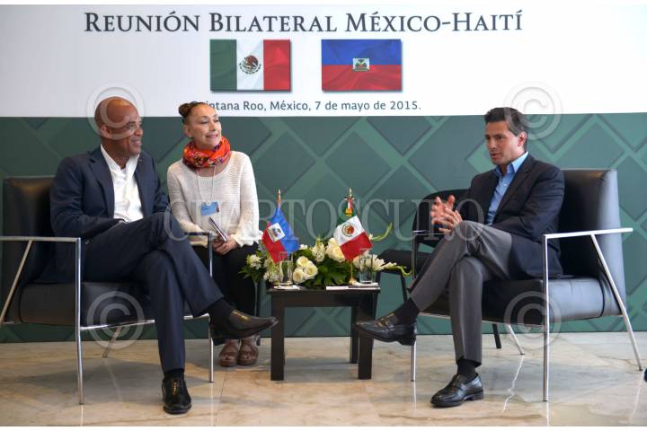 PLAYA DEL CARMEN, QUINTANA ROO, 07MAYO2015.- En el marco de sus actividades en el Foro Económico Mundial sobre América Latina 2015, los Presidentes de México, Enrique Peña Nieto, y de la República de Haití, Michel Joseph Martelly, sostuvieron hoy una reunión en la que se destacó el apoyo brindado por México a Haití en el desarrollo de proyectos integrales de reconstrucción de áreas urbanas, a través del Fondo de Infraestructura para países de Mesoamérica y el Caribe, así como el Programa de Becas, a través del cual el gobierno mexicano otorga 300 becas para nacionales haitianos para el periodo 2013-2015. FOTO: PRESIDENCIA /CUARTOSCURO.COM