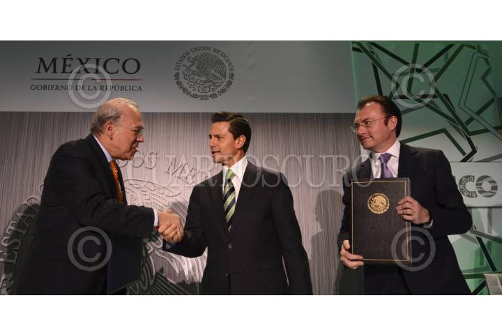 DAVOS, SUIZA, 24ENERO2014.- José Ángel Gurria, secretario general de la Organización de Cooperación y Desarrollo Económico; el presidente Enrique Peña Nieto y Luis Videgaray, secretario de Hacienda y Crédito Público asistieron a la 44 edición del Foro Económico Mundial. FOTO: PRESIDENCIA /CUARTOSCURO.COM