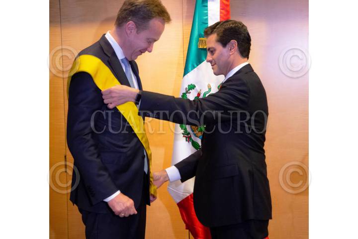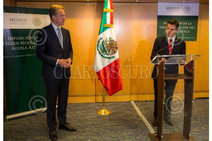NUEVA YORK, ESTADOS UNIDOS, 25SEPTIEMBRE2018.- El presidente Enrique Peña Nieto, impuso la Condecoración de la Orden Mexicana del Águila Azteca, en Grado de Banda, a Børge Brend, Presidente del Foro Económico Mundial, previo a su participación en la Cumbre del Foro Económico Mundial sobre el Impacto del Desarrollo Sostenible. FOTO: PRESIDENCIA /CUARTOSCURO.COM