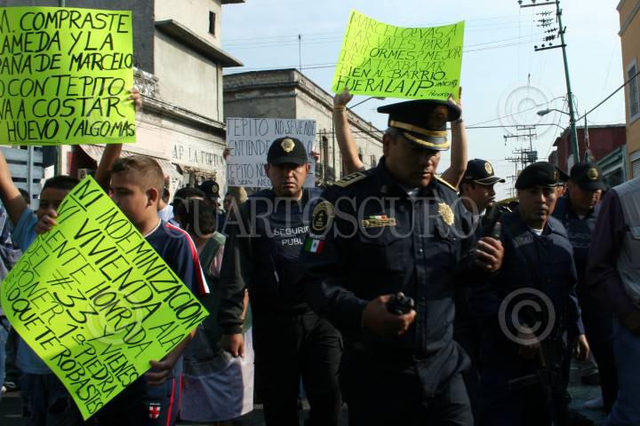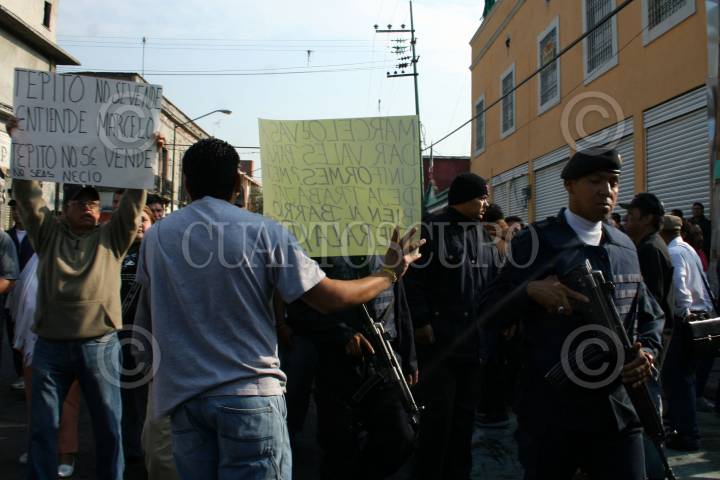 MÉXICO, D.F. 14MAYO2007.- Al término del acto oficial donde se inauguraron los trabajos del Centro Comunitario Tepito, donde antes fuera La Fortaleza, vecinos se manifestaron rodeados por elementos de seguridad. FOTO: PAOLA HIDALGO/CUARTOSCURO.COM