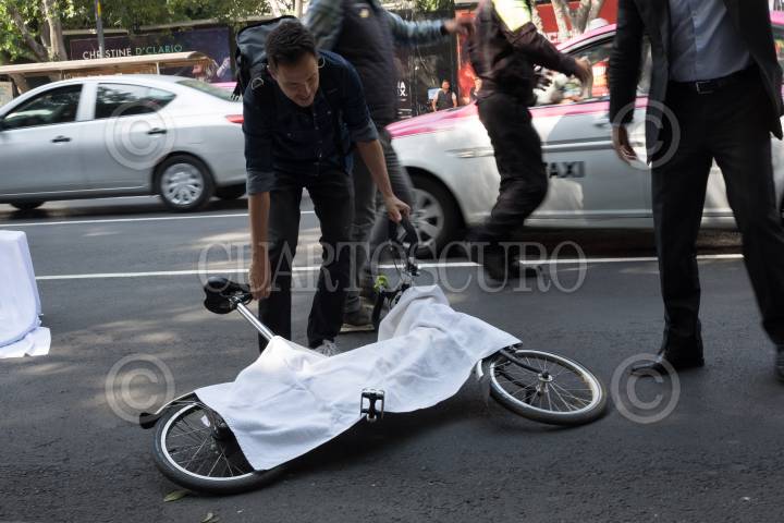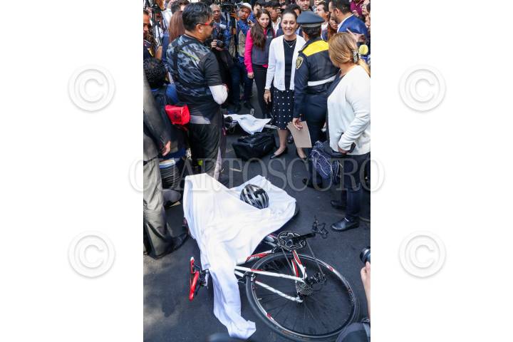 CIUDAD DE MÉXICO, 22ABRIL2019.- Ciclistas realizaron una protesta por los accidentes que se han ocasionado en la capital colocando bicicletas con una manta blanca durante la presentación de la entrada en vigor de las fotocívicas, encabezado por Andrés Lajos, secretario de movilidad y Claudia Seinbaum, jefa de Gobierno, las cuales aplican para multas por fotografía y automóviles particulares registrados en la capital. A partir de hoy, todas las placas contarán con 10 puntos que se irán restando dependiendo de la sanción cívica que se cometa. Los puntos se recuperan después de realizar trabajo comunitario o una platica de orientación sobre el Reglamento de Tránsito, si son más de siete puntos acumulados, el automóvil perderá su verificación. Las cámaras vehiculares se reubicaron en los puntos más conflictivos y con mayor afluencia de accidentes. Los funcionarios se dieron cita para dar el arranque del programa en el cruce de Darwin y Thiers, colonia Anzures, en la alcaldía Miguel Hidalgo. FOTO: GRACIELA LÓPEZ /CUARTOSCURO.COM