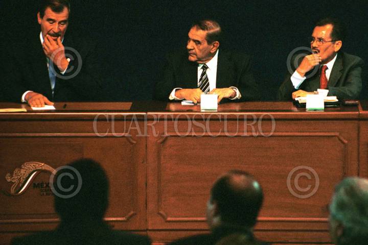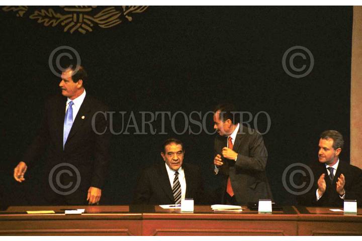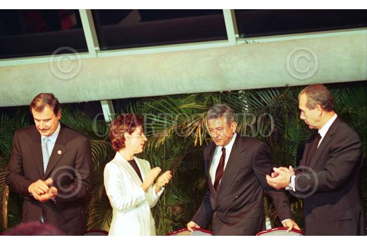 El presidente Vicente Fox y Francisco Gil Díaz, durante el acto "México a la Vanguardia en la Administración de la Deuda Externa" al que asistieron también John Snow del Tesoro de E.U., Horst Köhler del FMI. Fox anunció la liquidación anticipada de los bonos Brady. FOTO: Eunice Adorno/CUARTOSCURO.COM