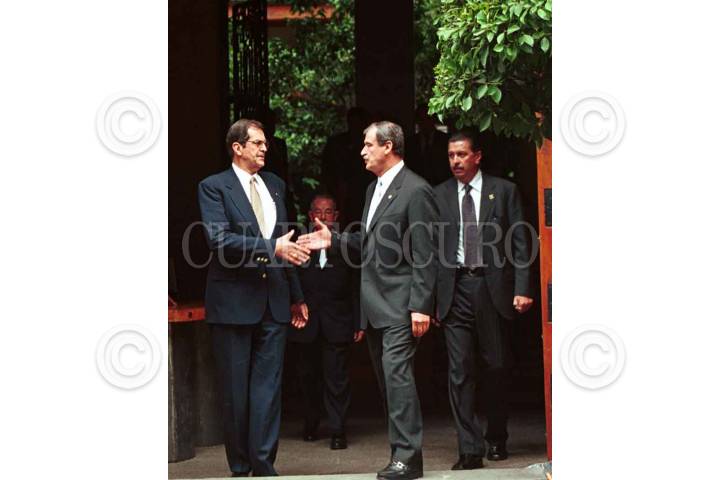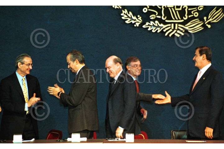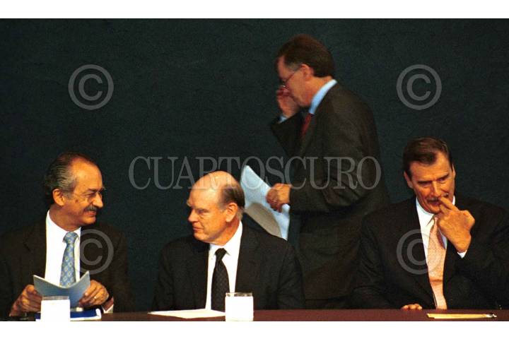 El presidente Vicente Fox y Francisco Gil Díaz, durante el acto "México a la Vanguardia en la Administración de la Deuda Externa" al que asistieron también John Snow del Tesoro de E.U., Horst Köhler del FMI. Fox anunció la liquidación anticipada de los bonos Brady.