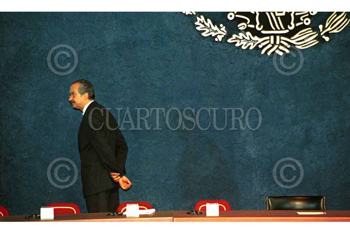 Francisco Gil Díaz, secretario de Hacienda y Crédito Público, antes de comenzar el acto, "México a la Vanguardia en la Administración de la Deuda Externa" al que asistieron también John Snow del Tesoro de E.U., Horst Köhler del FMI. Fox anunció la liquidación anticipada de los bonos Brady. FOTO: Eunice Adorno/CUARTOSCURO.COM