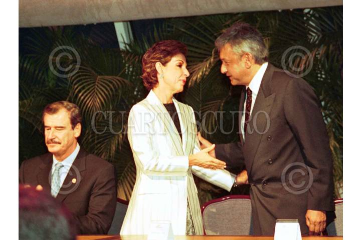 El presidente Vicente Fox acompañado de su esposa Martha Sahagún y Andrés Manuel López Obrador, durante la inaguración de la La Torre Mayor, esta noche en Paseo de la Reforma. FOTO: Eunice Adorno/CUARTOSCURO.COM