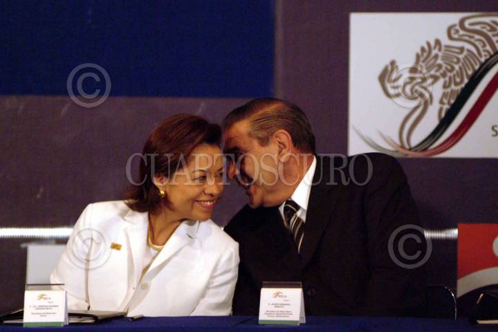 Josefina Vazquez Mota, secretaria de Desarollo Social y Javier Usabiaga secretario de la SAGARPA, conversan durante la ceremonia de inauguración de la Semana PYMES 2003. FOTO: Nelly Salas/CUARTOSCURO.COM