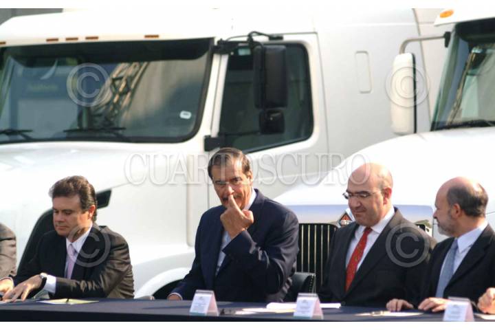 Vicente Fox, junto con Juan José Guerra, presidente de la Asociación Nacional de Productores de Autobuses, durante la ceremonia de presentación del Programa de Financiamiento al Pequeño Transportista 2003, en donde el mandatario afirmó que se está despejando la incertidumbre económica mundial, por lo que su Gobierno está posicionando a la nación para sacar ventaja de este nuevo escenario en las expectativas. FOTO: Eunice Adorno/CUARTOSCURO.COM