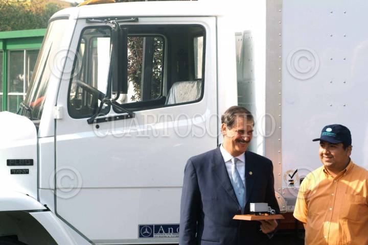 Dentro de la presentación del Programa de Financiamiento al Pequeño Transportista 2003, realizado en el Museo Tecnológico de la CFE, Vicente Fox Quesada entregó unidades de camiones a pequeños transportistas y mencionó "que el crédito impulsa el desarrollo en materia económica al país". FOTO: Eunice Adorno/CUARTOSCURO.COM