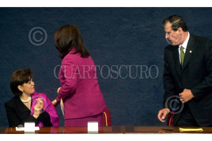 A las afueras del Archivo General de la Nación, Patricia Luna Directora del Instituto de la Mujer, conversa con el presidente Vicente Fox y su esposa, Martha Sahagun de Fox. Christian Palma/CUARTOSCURO.COM