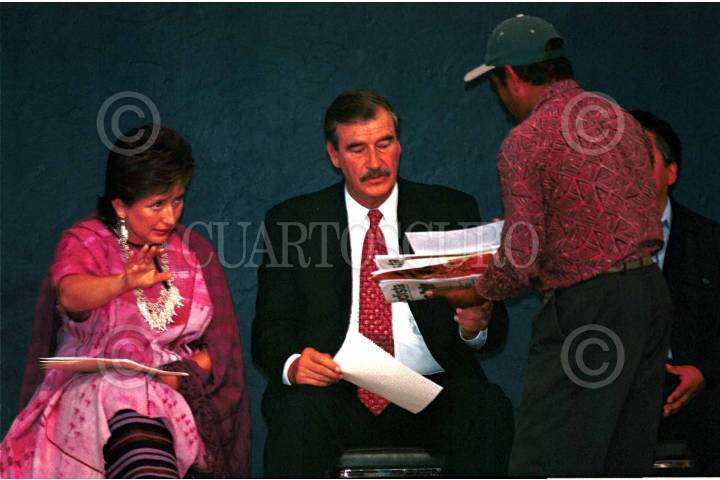 Durante el encuentro con productores indígenas, Xochitl Gálvez, encargada para la atención de estos pueblos, pide a uno de sus integrantes que se retire, luego de entregar un documento al Presidente Fox. FOTO: Juan Pablo Zamora/CUARTOSCURO.COM