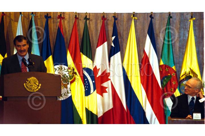 Vicente Fox encabezó la ceremonia de clausura del XXIII periodo ordinario de sesiones de la Comisión Interamericana para el Control del Abuso de Drogas (CICAD), el presidente reconoció al gobierno de Washington por poner fin al proceso de certificación. A su izquierda David Deall, presidente saliente de CICAD. FOTO: Susana Navarrete/CUARTOSCURO.COM