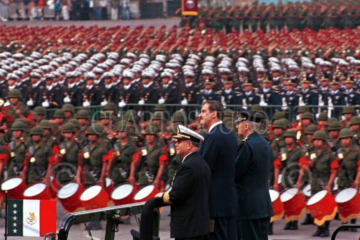 El presidente Vicente Fox, el general Ricardo Clemente Vega García, secretario de la Defensa y el almirante, Marco Antonio Peyrot, secretario de la Marina, pasan revista 22 mil quinientos elementos de la las fuerzas armadas que participaron en el desfile militar, en la plancha del zócalo capitalino. FOTO: Oswaldo Ramírez/CUARTOSCURO.COM