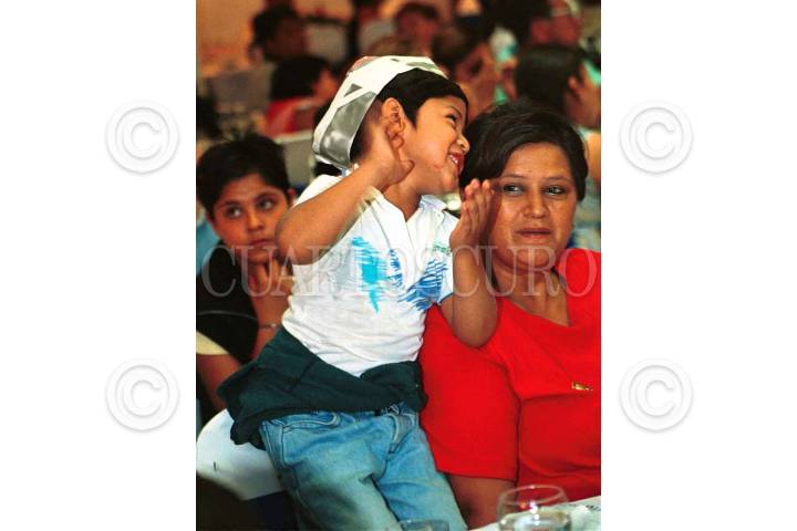 Una familia de voceadores de la ciudad de México, escucha el discurso de Vicente Fox, durante el desayuno en conmemoración del "El día del voceador " que se llevó a cabo en el casino del Campo Marte. FOTO: Eunice Adorno/CUARTOSCURO.COM
