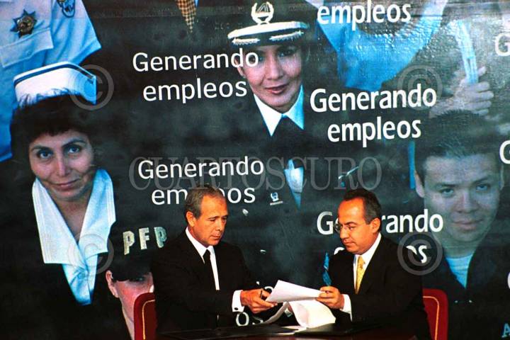 Pedro Cerisola, secretario de Comunicaciones y Tranportes, junto con Felipe Calderón Hinojosa, director general del Banco Nacional de Obras y Servicios Públicos, firmaron un acuerdo de Constitución del Fondo Carretero, durante el programa de Desarrollo de Aupistas de Cuota para la Mosernización de Corredores en el 2003. FOTO: Eunice Adorno/CUARTOSCURO.COM