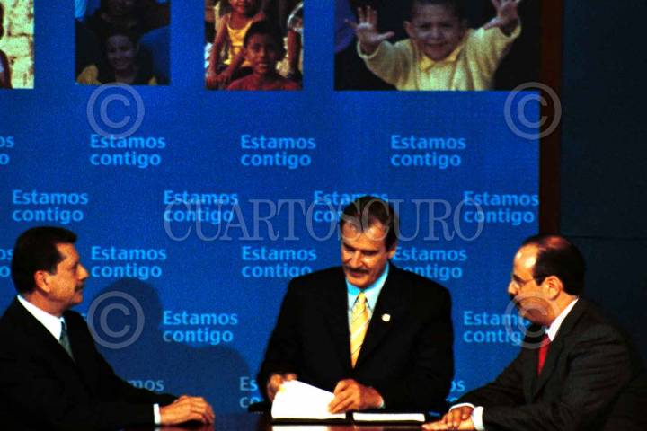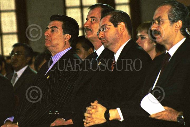 Enrique Jackson, presidente de la Mesa directiva del Senado, Vicente Fox Quesada presidente de México, y Armando Salinas Torre presidente de la mesa directiva de la cámara de diputados, durante la reunión para la firma decreto por el que se expide la Ley del Servicio Profesional de Carrera en la Administración Pública Federal, que se llevó a cabo en el salón Adolfo López Mateos de la residencia oficial de Los Pinos. FOTO: Eunice Adorno/CUARTOSCURO.COM