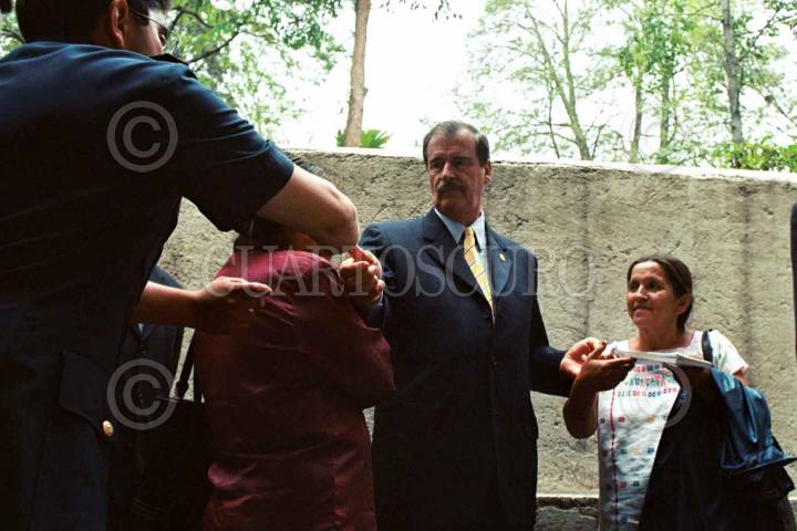Vicente Fox, presidente de México, al término de la inauguración del Encuentro Nacional de Empresas Sociales Exitosas, (FONAES), saluda a una familia beneficiada del programa. FOTO: Eunice Adorno/CUARTOSCURO.COM