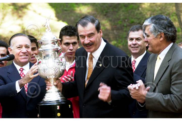 Valentín Díez Morodo, propietario del equipo Diablos Rojos del Toluca y el presidente Vicente Fox comparten un instante el trofeo que acredita a los Diablos como equipo campeón del toreno de futbol nacional.FOTO: Oswaldo Ramírez/CUARTOSCURO.COM