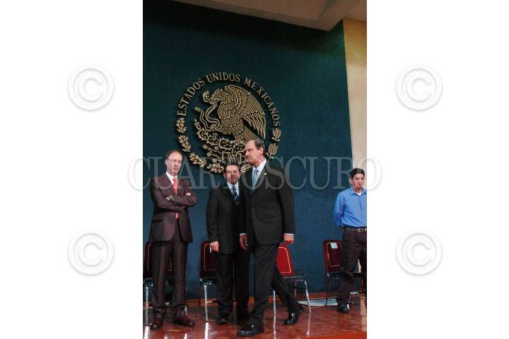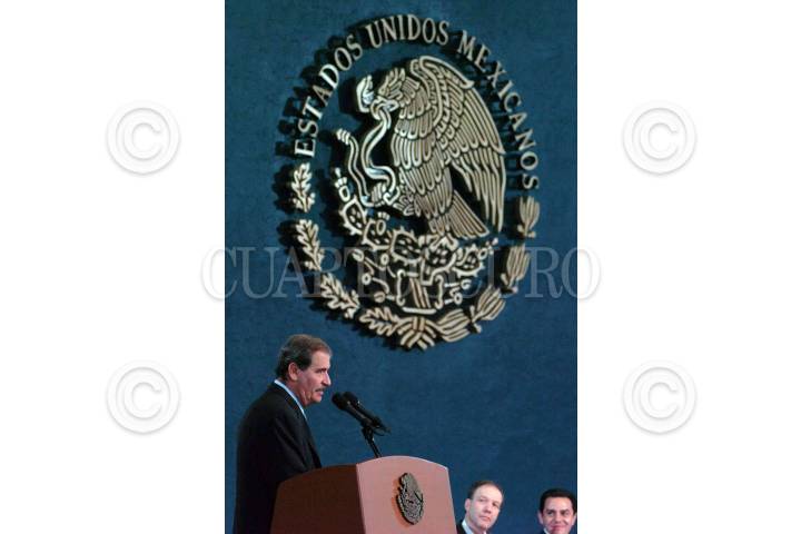 MEXICO D.F. 06MARZO2006.- ARCHIVO.- Imagen captada el 4 de mayo del 2004. Felipe Calderon Hinojosa, secretario de Energía, Napoleón Gómez, secretario general de trabajadores mineros y el presidente Vicente Fox durante la ceremonia de apertura de la XXXIII Convención General del Sindicato de Trabajadores Mineros y Metalurgicos. FOTO: Eunice Adorno/CUARTOSCURO.COM
