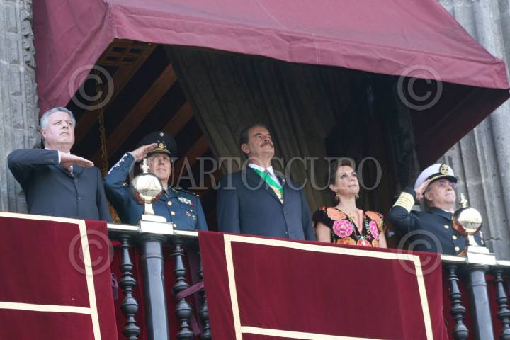 MÉXICO, D.F. 16SEPTIEMBRE2006.- Desde el Balcón presidencial, Vicente Fox, primer mandatario, el secretario de Marina, Marco Antonio Peyroy González, el secretario de la Defensa Ncional, Ricardo Vega García y Martha Sahagún de Fox, presenciando el desarrollo del tradicional desfile. FOTO: PAOLA HIDALGO/CUARTOSCURO.COM