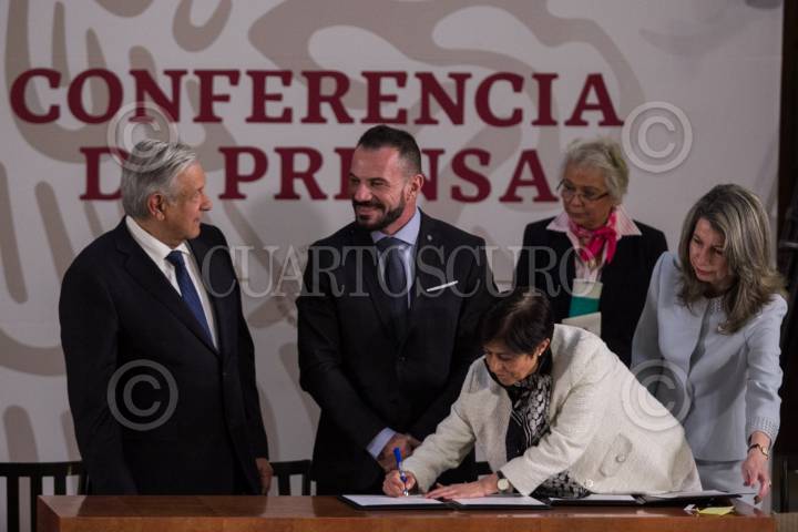 CIUDAD DE MÉXICO, 22FEBRERO2019.- Andrés Manuel López Obrador, presidente de México; Frédéric Vacheron, representante de la UNESCO; Blanca Jiménez Cisneros, titular de Conagua; Olga Sánchez Cordero, secretaria de Gobernación, y Katia Argueta, representante de la ONU, durante la conferencia matutina donde firmó un acuerdo en conjunto con la Organización de las Naciones Unidas para la Educación, la Ciencia y la Cultura (UNESCO) y la Organización de las Naciones Unidas (ONU) para realizar pruebas que constaten que el proyecto de la termoeléctrica no afectará el agua de los estados. Asimismo, el jefe del ejecutivo anunció que se realizará una segunda subasta de vehículos de lujo para juntar fondos para la Guardia Nacional. FOTO: GALO CAÑAS /CUARTOSCURO.COM