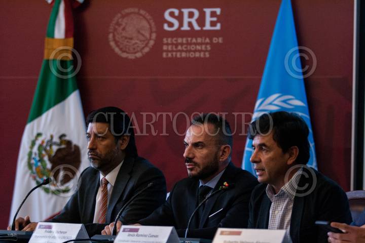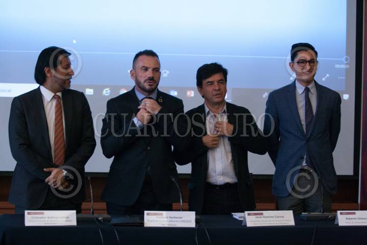 CIUDAD DE MÉXICO, 09JULIO2019.- Frédéric Vacheron, representante alterno UNESCO en México, y Jesús Ramírez Cuevas, director de Comunicación Social y Vocero de la Presidencia de la República, durante la conferencia de prensa para anunciar el “Seminario del Día Internacional de Lucha contra la Impunidad de los Crímenes contra Periodistas”. FOTO: GALO CAÑAS /CUARTOSCURO.COM