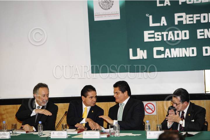 MÉXICO, D.F., 20FEBRERO2013.- José Alberto Aguilar, Silvano Aureoles Conejo, coordinador de los diputados federales del PRD, Mario López Valdez, gobernador de Sinaloa, y Francisco Arroyo Vieyra, presidenta de la mesa directiva de la Cámara de Diputados, durante la presentación del libro "La Reforma del Estado en México, Un camino de Acuerdos", en el Palacio Legislativo. FOTO: CUARTOSCURO.COM