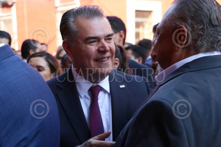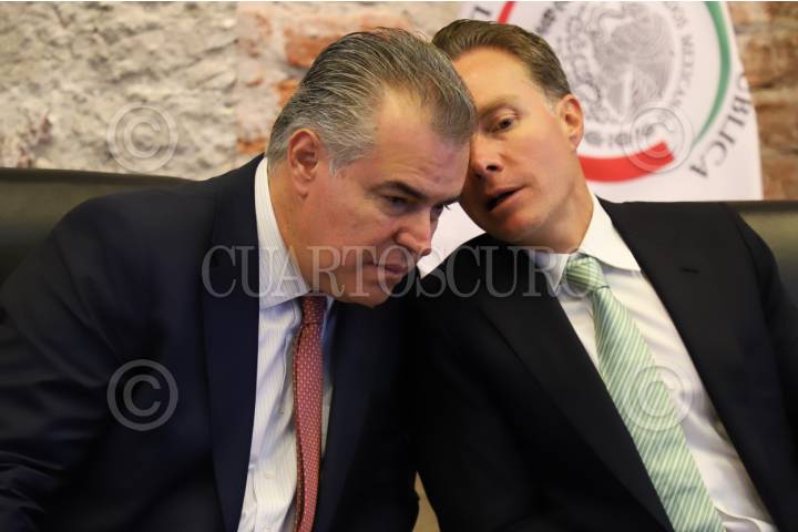 CIUDAD DE MÉXICO, 26AGOSTO2025.- Francisco Cervantes, presidente del CCE, dialoga con el coordinador de la bancada del Partido Verde en el Senado, Manuel Velasco, durante la reunión plenaria de los legisladores del PVEM. FOTO: DANIEL AUGUSTO/ CUARTOSCURO.COM