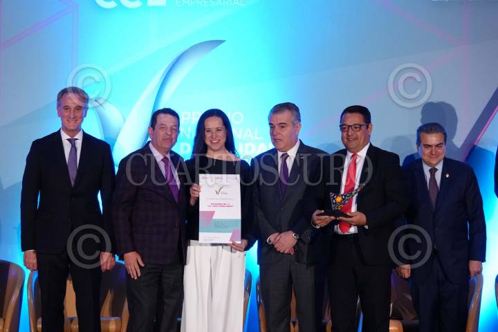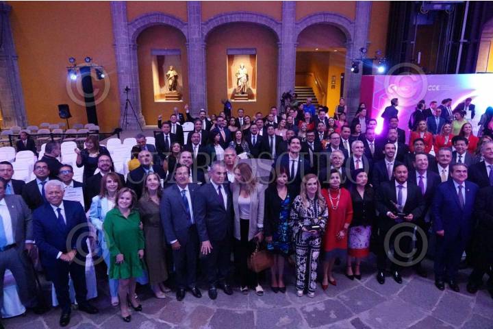 CIUDAD DE MÉXICO, 11JUNIO2024.- Francisco Cervantes Díaz, presidente de Consejo Coordinador Empresarial; Fadlala Akabai, secretario de Desarrollo Económico del Gobierno de la capital, y Roberto Moya, presidente de la Comisión de Economía en el Senado, acompañados de los ganadores del Premio Nacional de Calidad 2024 en el Club de Banqueros. FOTO: GRACIELA LÓPEZ /CUARTOSCURO.COM