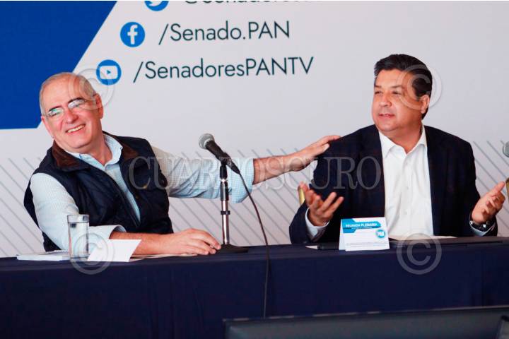 Julen Rementería, coordinador de los senadores del PAN; Marko Cortés, dirigente del PAN, y Francisco García Cabeza de Vaca, gobernador de Tamaulipas, durante los trabajos de la reunión plenaria de los senadores panistas.