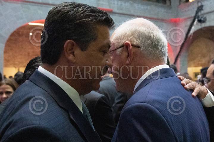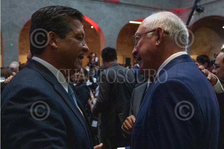 El gobernador de Tamaulipas, Francisco García Cabeza de Vaca, conversa con el embajador estadounidense, Ken Salazar, durante el informe de actividades de la Presidenta del Senado, Olga Sánchez Cordero.