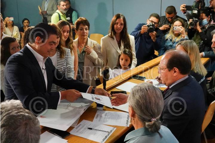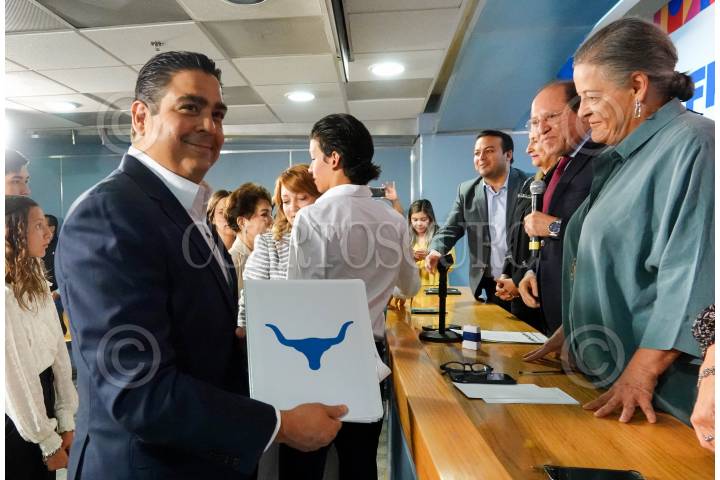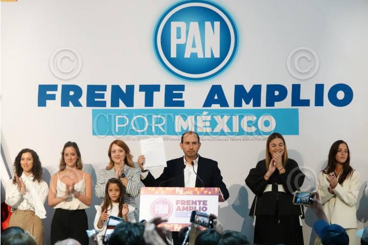 Marko Cortés, presidente ejecutivo del PAN, muestra el registro del aspirante Francisco García Cabeza de Vaca, para la candidatura para la presidencia por Frente Amplio por México en las inmediaciones del Partido Acción Nacional