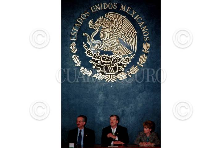 El presidente Vicente Fox, Francisco Gil Díaz secretario de Hacienda y la vocera Martha Sahagún, durante la resunión que sostuvo en los pinos con directivos de medios de comunicación de provincia. FOTO: Alberto Valdéz/CUARTOSCURO.COM.