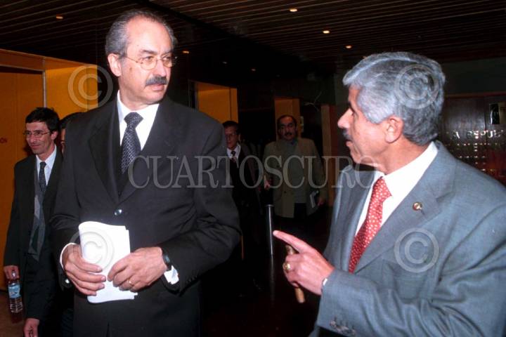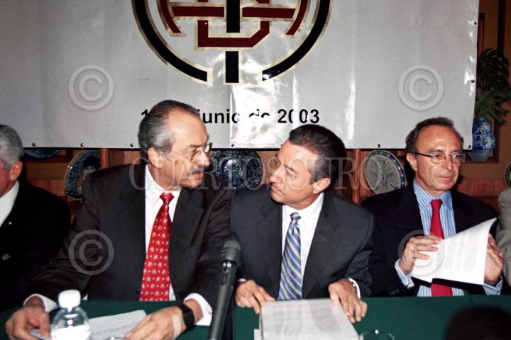 Francisco Gil Díaz, Secretario de Hacienda y Crédito Público, platica con Manuel Medina Mora, presidente de la Asociaciòn de Banqueros, a su lado Guillermo Ortiz, Gobernador del Banco de México, durante la presentación de las ¨Acciones de Financiamiento de la Banca¨. FOTO: Moisés Pablo/CUARTOSCURO.COM