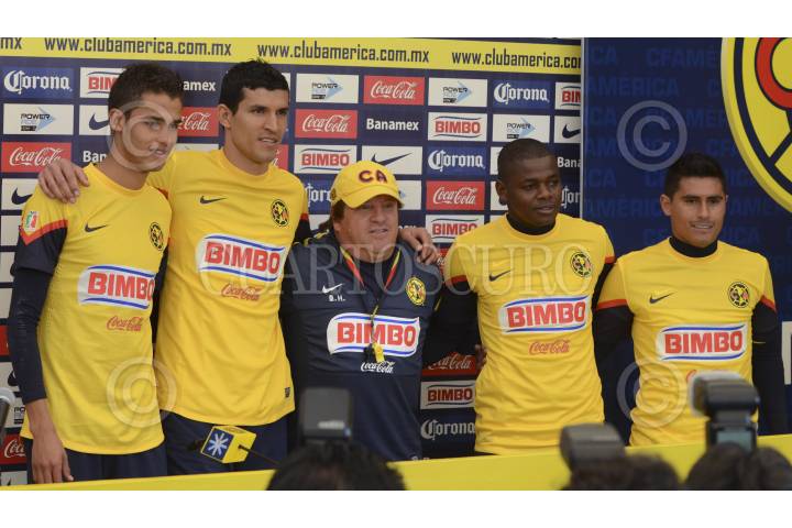 MÉXICO, D.F., 03ENERO2013.- Francisco "El Maza" Rodríguez (segundo de izquierda a derecha), fue presentado como nuevo refuerzo de las Águilas del América en las instalaciones de Coapa. FOTO: IVAN MÉNDEZ /CUARTOSCURO.COM