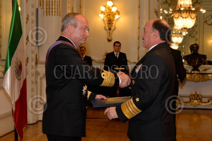 SANTIAGO DE CHILE, CHILE, 26JUNIO2015.- Francisco Soberón Sanz, Secretario de Marina y Alto Mando de la Armada de México, al termino de la gira de trabajo por la República de Chile, donde fue condecorado con la "Orden del Mérito Naval". FOTO: SEMAR /CUARTOSCURO.COM