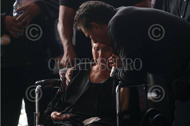 VALLE DE CHALCO, ESTADO DE MÉXICO, 03NOVIEMBRE2019.- Miles de personas asistieron al Homenaje que se realizó a Francisco Tenorio, ex presidente municipal de Valle de Chalco, quién fue baleado el martes pasado cuando realizaba una visita guiada en una unidad habitacional en el municipio y posteriormente fue trasladado al Hospital Regional, en donde recibió atención médica. El acto se llevó a cabo en la explanada de Valle de Chalco. En la imagen, Iginio Sandoval, secretario del H Ayuntamiento Constitucional de Valle de Chalco y la madre de Francisco Tenorio. FOTO: GRACIELA LÓPEZ /CUARTOSCURO.COM