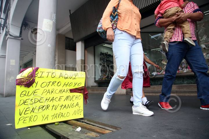 CUERNAVACA, MORELOS, 17JUNIO2019. Un mensaje escrito en una cartulina dirigido al alcalde de la capital, Francisco Villalobos, está sobre una caja en un hoyo ubicado en la acera de la calle Hidalgo en el centro de la ciudad. El mensaje dice: “Lobito aquí hay otro hoyo qué parchar desde hace mucho, ven por tu tanga, ¿pero ya tápalo no? “. Una declaración del alcalde en un programa de radio donde añoraba los tiempos en que sentado en un bar veía pasar a las chicas con pantalón blanco y podía admirar la tanga sin que pasara nada, es el origen de este mensaje. FOTO: MARGARITO PÉREZ RETANA /CUARTOSCURO.COM