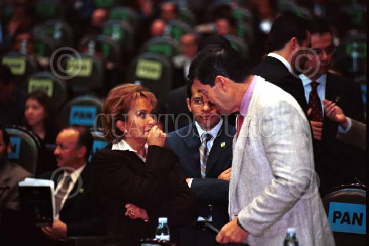 Elba Esther Gordillo y Francisco Barrio, dirigentes del PRI y PAN en San Lázaro, platican durante la instalación de la primera sesión parlamentaria en la Cámara de Diputados. FOTO: Juan Pablo Zamora/CUARTOSCURO.COM