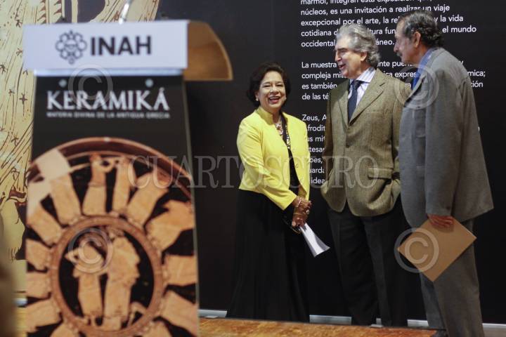 MÉXICO, D.F., 28ENERO2014.- María teresa Franco, directora del INBA y Rafael Tovar y de Teresa, presidente del Conaculta, inauguraron la exposición "Keramiká materia divida de la antigua Grecia", la cual iniciará las celebraciones por el 75 aniversario del Instituto Nacional de Antropología e Historia. FOTO: MOISÉS PABLO /CUARTOSCURO.COM
