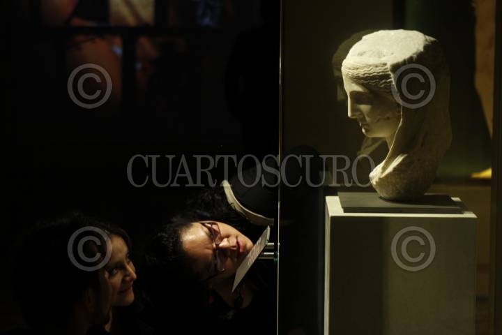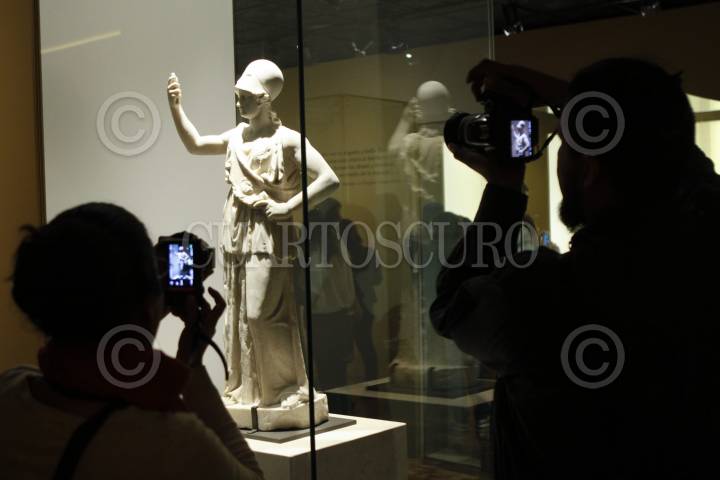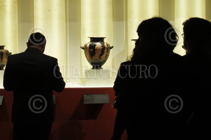 MÉXICO, D.F., 28ENERO2014.- Proveniente de las colecciones del Museo del Louvre, en Francia, la exposición "Keramiká materia divida de la antigua Grecia", iniciará las celebraciones por el 75 aniversario del Instituto Nacional de Antropología e Historia. La muestra será inaugurada el 28 de enero y reúne 94 piezas de mas de dos mil años de antigüedad, la mayoría cerámica, ademas de cinco esculturas de mármol. La exposición aborda el universo de la mitología griega, el cual fue plasmado por los artistas griegos en escenas protagonizadas por dioses como Zeus, Hera, Apolo y Dionisio, así como en acontecimientos mundanos como el matrimonio o los funerales. FOTO: MOISÉS PABLO /CUARTOSCURO.COM