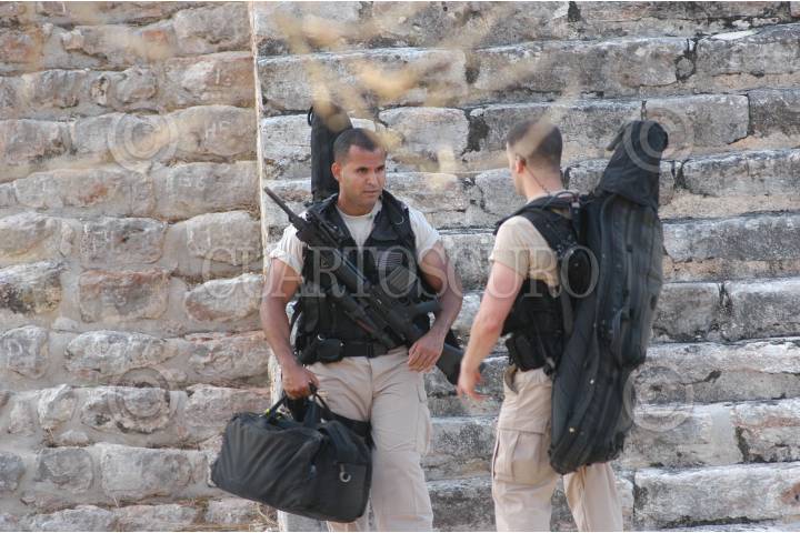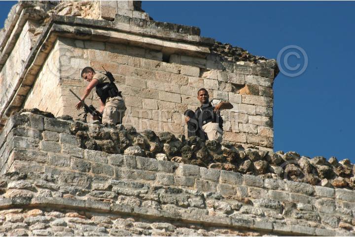 UXMAL, YUCATÁN 13MARZO2007.- Francotiradores del ejercito de los Estados Unidos, vigilan desde los alto de una de las piramides de la zona arqueologicas donde los mandatarios de los Estados unidos y de México realizarón un recorrido. FOTO: GUILLERMO PEREA/CUARTOSCURO.COM