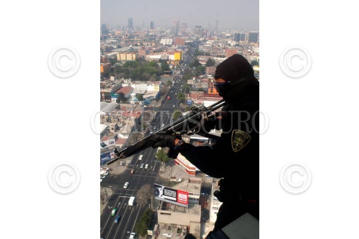 MÉXICO, D.F., 13FEBRERO2009.- Con francotiradores del grupo de los "Zorros" de la Secretaria de Seguridad Pública del DF sobrevolarán en helicópteros del grupo de los "Cóndores", los puntos con más indices de delincuencia de la capital. Esta mañana el titular de la SSP dio el banderazo de la salida a un operativo para la prevención del delito. FOTO: JULIETA MORA/CUARTOSCURO.COM