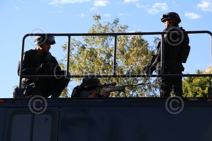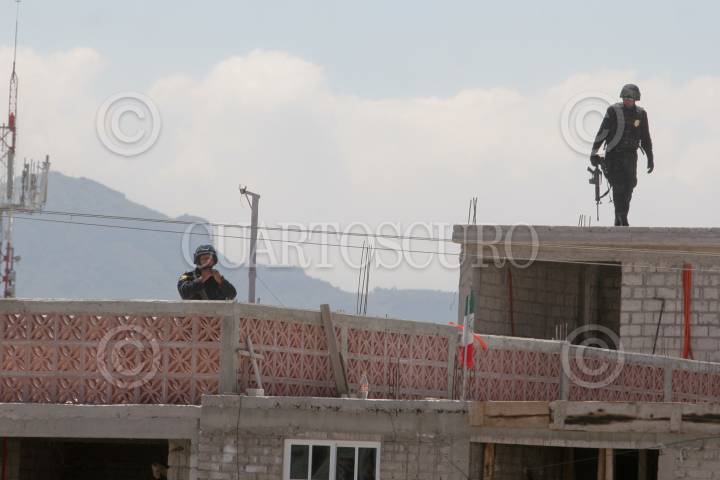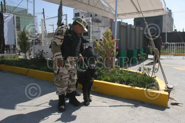 CIUDAD NEZAHUALCOYOTL, ESTADO DE MÉXICO, 07OCTUBRE2010.- Decenas de elementos de seguridad entre los que figuran francotiradores, granaderos, policía montada, perros para la detección de artefactos explosivos, patrulleros y detectores de metales, se observan en los eventos a los que acude el gobernador del Estado de México, Enrique Peña Nieto. FOTO: SAÚL LÓPEZCUARTOSCURO.COM