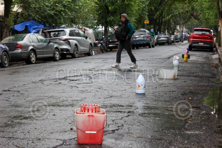 CIUDAD DE MÉXICO, 19JUNIO2025.- Personas que se dedican a apartar lugares en las calles de la colonia Doctores utilizan botes de plástico para que ciudadanos no se estacionen, sin el debido pago de cuota. Hace unos días la Jefa de Gobierno anuncio un programa para ordenar está actividad y evitar abusos de los "viene viene". FOTO: MOISÉS PABLO/CUARTOSCURO.COM